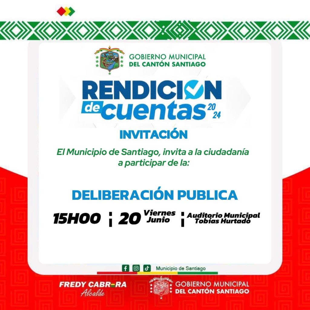 El Gobierno Municipal del cantón Santiago, liderado por el alcalde Ing. Fredy Cabrera, invita a toda la ciudadanía a ser parte de la Deliberación Pública de la Rendición de Cuentas 2024. 🗣️📊